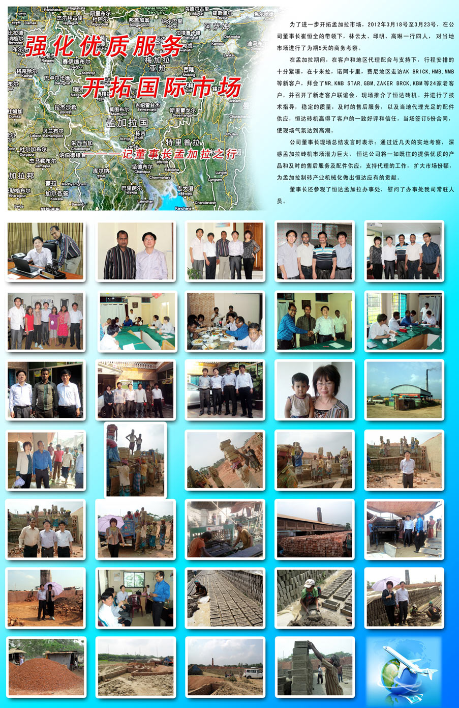 在孟加拉期間,公司得到了當(dāng)?shù)卮砩痰亩αχС,召開了新老客戶聯(lián)誼會(huì),對(duì)當(dāng)?shù)厥袌?chǎng)的磚瓦行情進(jìn)行深入交流。當(dāng)前孟加拉多半還是手工制磚,而且國家已經(jīng)出臺(tái)了政策,截至2015年取消手工做磚。這對(duì)于公司來說是個(gè)很大的機(jī)遇。但同時(shí),競(jìng)爭也是激烈的,各個(gè)磚機(jī)廠紛紛涌入孟加拉市場(chǎng),加強(qiáng)對(duì)當(dāng)?shù)厥袌?chǎng)的開發(fā),可以說機(jī)遇與挑戰(zhàn)并存的,這就要求公司要嚴(yán)抓產(chǎn)品質(zhì)量,加強(qiáng)售后服務(wù),爭取使我們的機(jī)器遍布孟加拉市場(chǎng)。