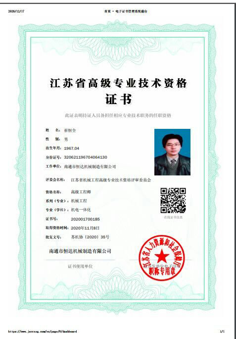 經(jīng)過書面材料審核,常州現(xiàn)場(chǎng)面試,南通恒達(dá)公司董事長(zhǎng)崔恒全同志通過層層考核,獲評(píng)高級(jí)工程師并頒發(fā)證書。
