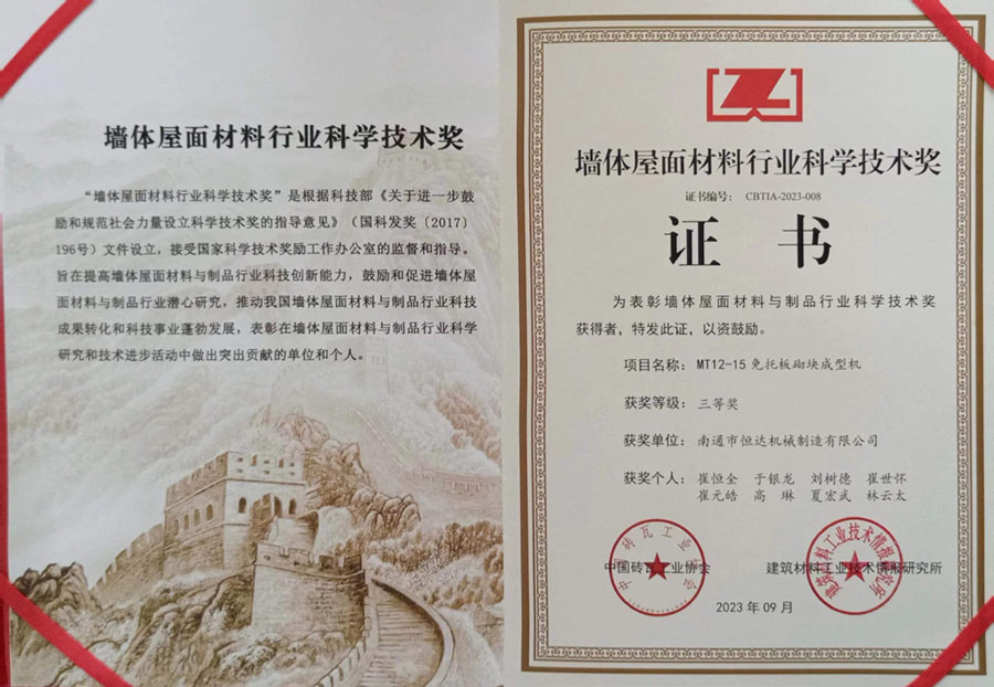 南通市恒達(dá)機(jī)械制造有限公司獲得墻體屋面材料行業(yè)科學(xué)技術(shù)三等獎(jiǎng)。