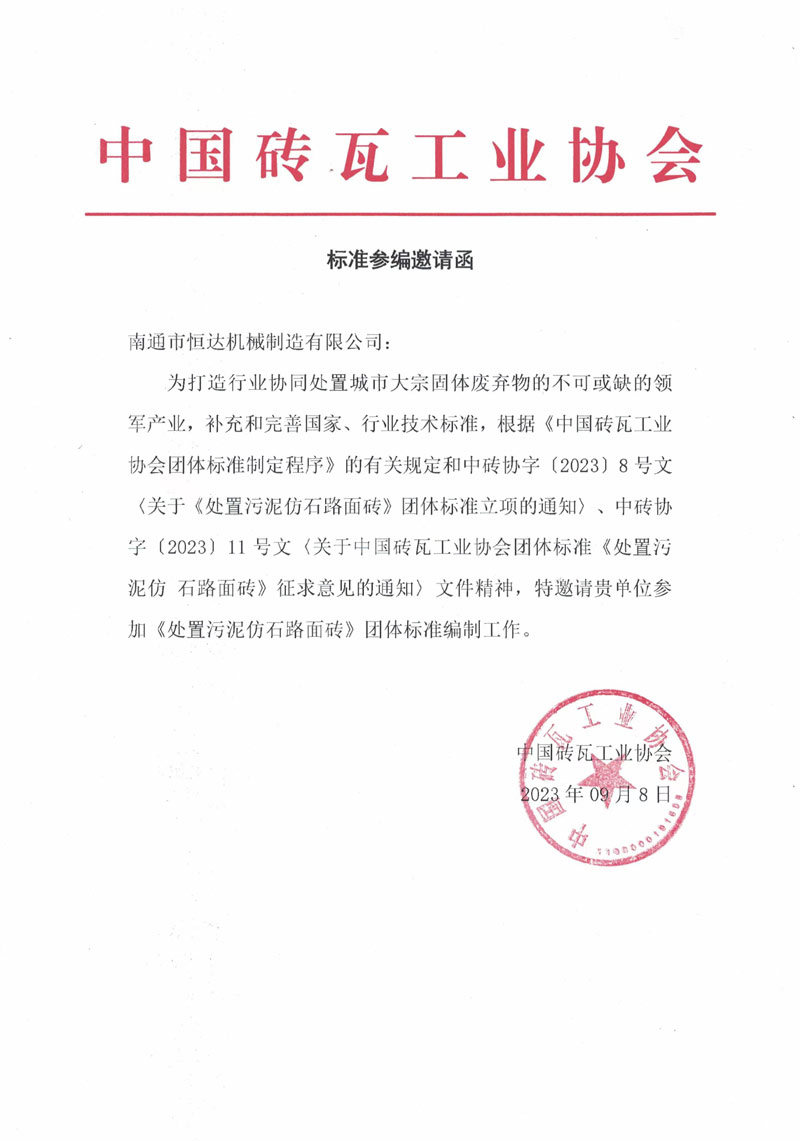 行業(yè)要健康發(fā)展,標(biāo)準(zhǔn)必須先行。再此背景下,2023年10月21-22日,在中國杭州,中國磚瓦協(xié)會及時(shí)的組織了行業(yè)骨干企業(yè),群策群力,制定高質(zhì)量標(biāo)準(zhǔn)。南通市恒達(dá)機(jī)械制造有限公司董事長崔恒全和技術(shù)總工于銀龍受邀請參加,為標(biāo)注的制定貢獻(xiàn)恒達(dá)力量。
