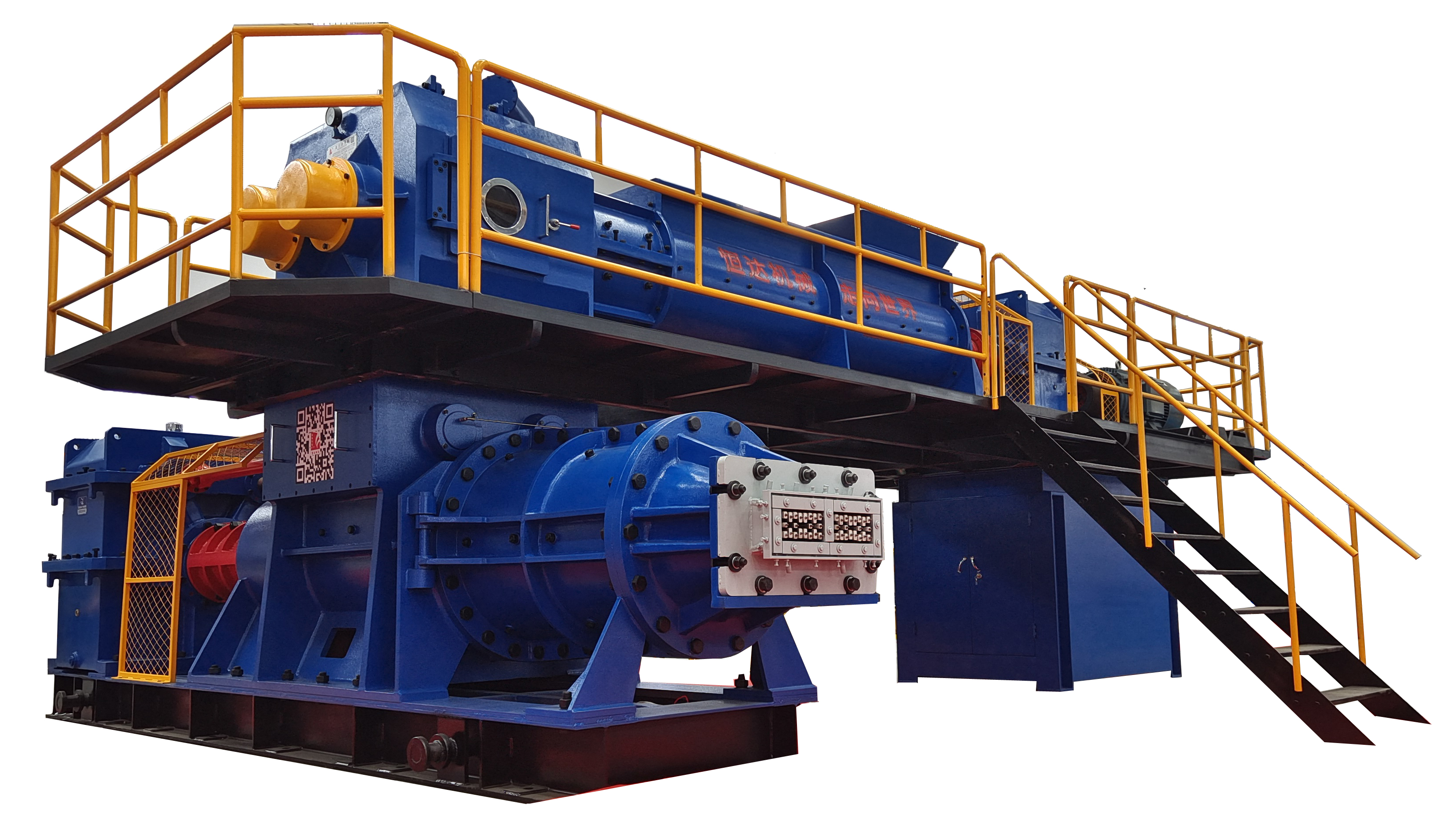 該機采用上、下級單獨傳動,上級采用單軸攪拌,箱體采用鋼板焊接,擠出壓力大,適用于高孔洞率,薄壁多孔的頁巖,煤矸石、粘土磚的硬塑成型。